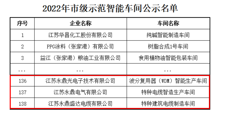 2022年10月10日,蘇州工業(yè)和信息化局公布了“2022年蘇州市級(jí)示范智能車間名單”,永鼎旗下三家子公司江蘇永鼎光電子技術(shù)有限公司、江蘇永鼎電氣有限公司、江蘇永鼎盛達(dá)電纜有限公司入選。